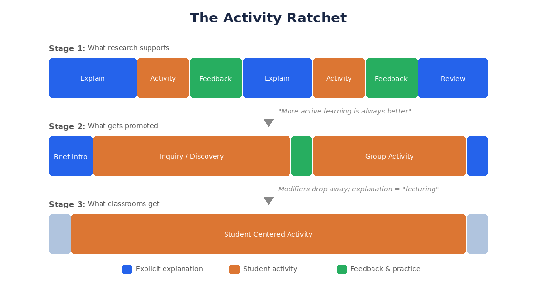 I call this the “activity ratchet.” Research findings that support modest engagement get progressively reinterpreted as mandates to minimize explanation altogether. Researchers preach nuance—“guided inquiry,” “scaffolded discovery”—but practitioners hear only the prestige term: active, inquiry, student-centered. The modifiers drop away. Teachers who explain clearly, correct errors promptly, and ensure students actually learn often feel they’re doing something wrong.